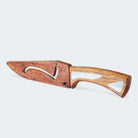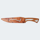 A bainha, também em madeira Jatobá, é um complemento à faca. Com encaixe preciso, ela se fixa à lâmina com o auxílio de uma trava magnética, garantida por um discreto pino preto. Este design assegura que a faca permaneça segura e protegida quando não estiver em uso.