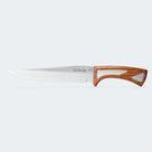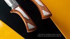 O cabo em madeira Jatobá não só confere um toque refinado à faca, mas também promete durabilidade e conforto no manuseio. Com insertos em aço inox meticulosamente posicionados, o design do cabo se destaca, realçando a beleza natural da madeira.