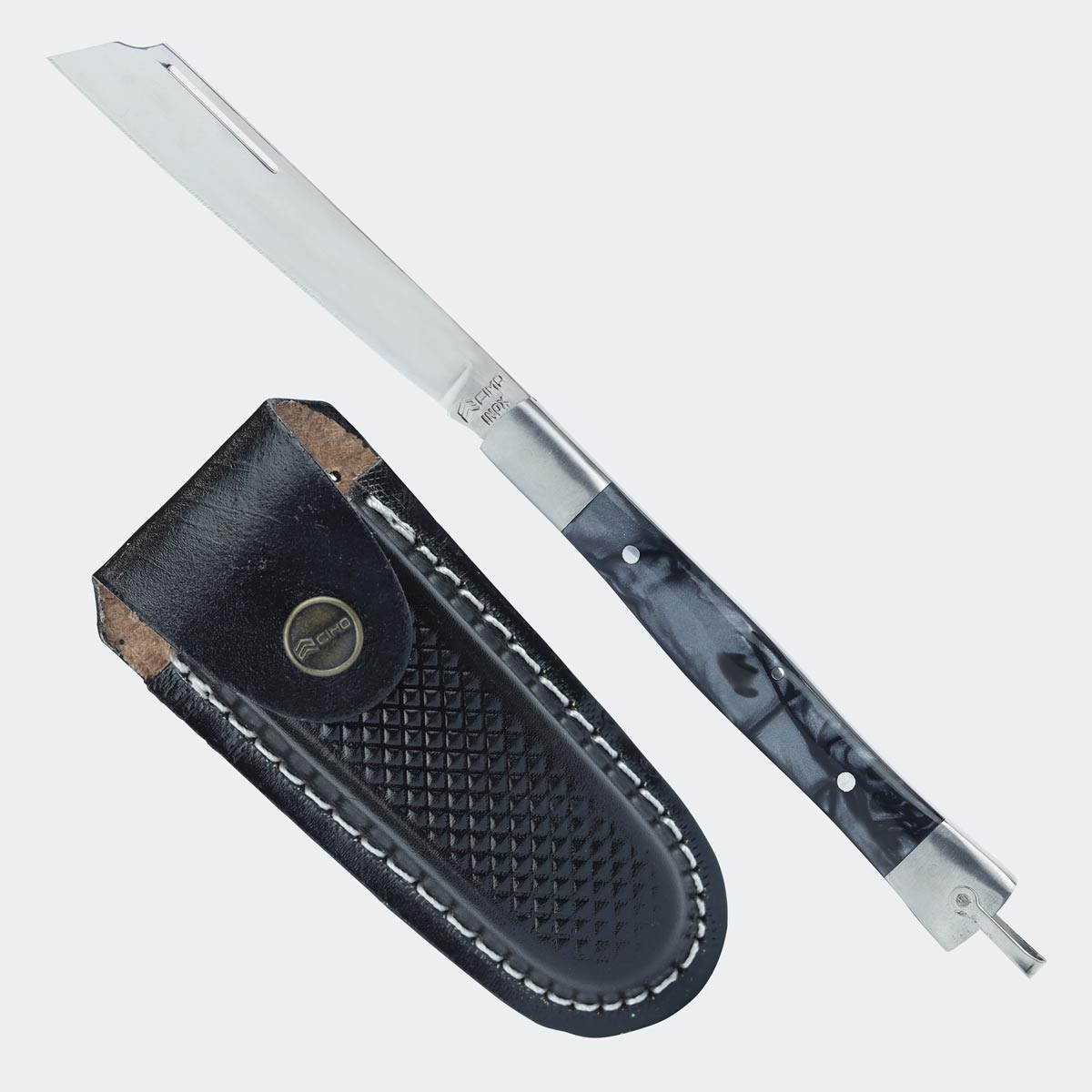 As bainhas dos canivetes da CIMO são feitas em couro resistente. Esse material proporciona durabilidade prolongada e um acabamento tradicional valorizado por colecionadores e usuários profissionais, assim como resistência adicional contra atritos e possíveis desgastes da lâmina.