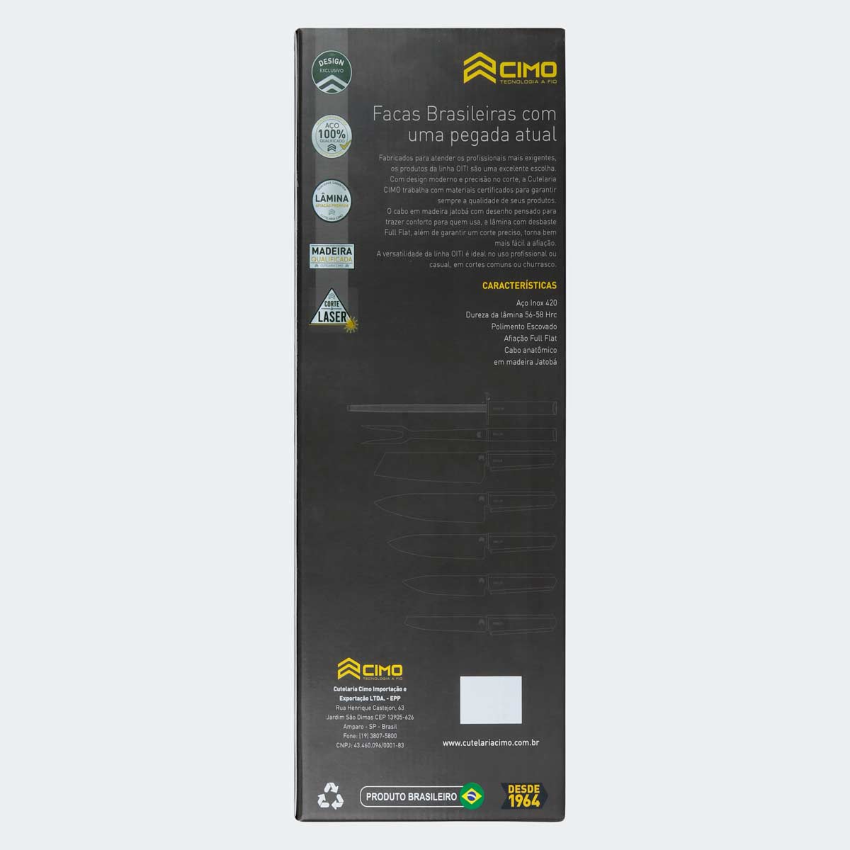 As facas da linha Oiti são fabricadas em aço inoxidável 420, garantindo afiamento preciso e estética clássica, produtos resistentes à ação do tempo. Nas seções da Cutelaria Cimo você encontra facas do Chef em 8 polegadas, acessando também, modelos de lâminas com 7 ou 6 polegadas, bem como conjuntos para churrasco completos. Confira estas oportunidades!