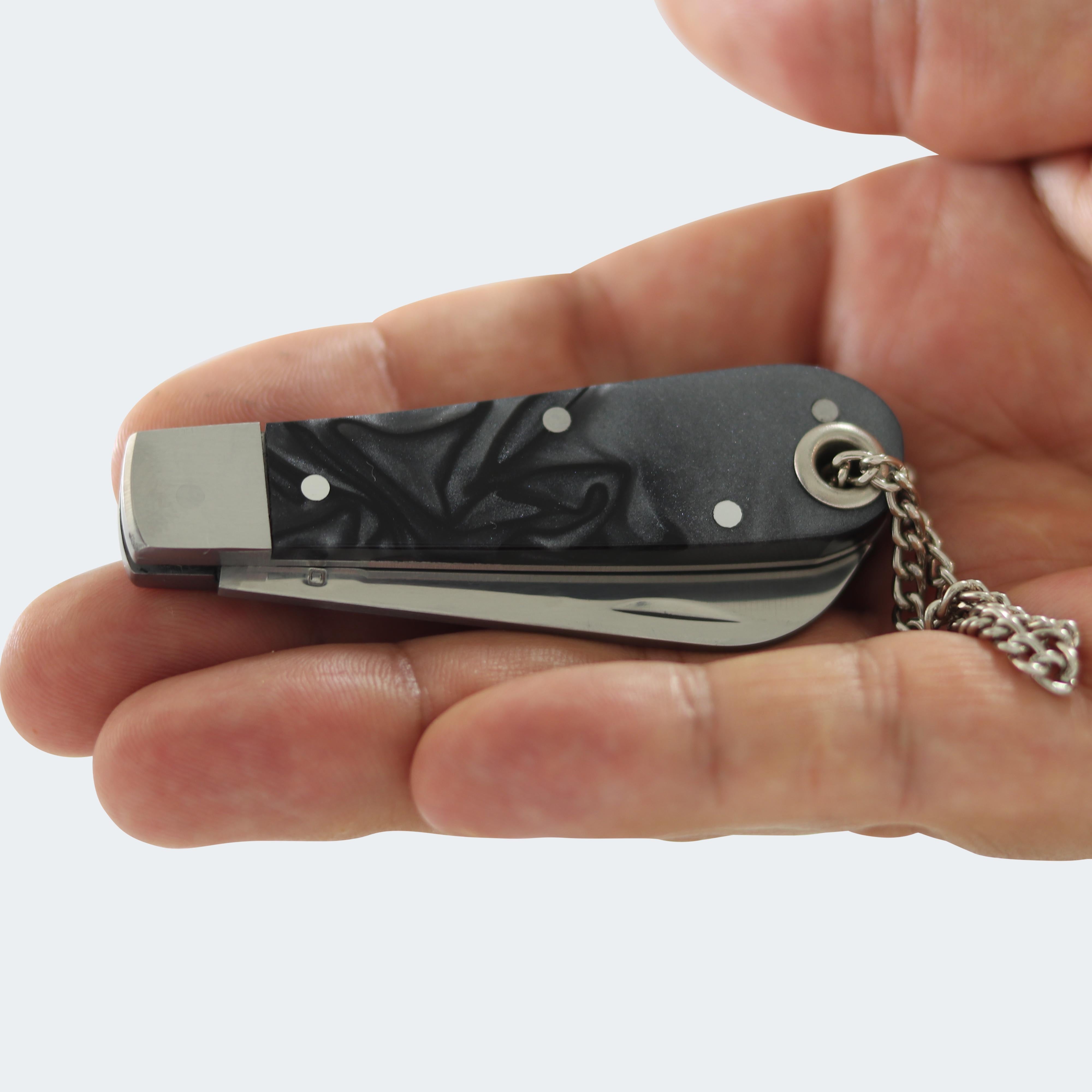 Canivete lâmina em aço inox 420 com cabo de acrílico com Bainha. Pequeno e prático, para o dia a dia. Sua ponta arredondada ajuda a evitar acidentes. Acompanha corrente, podendo ser utilizado como chaveiro.