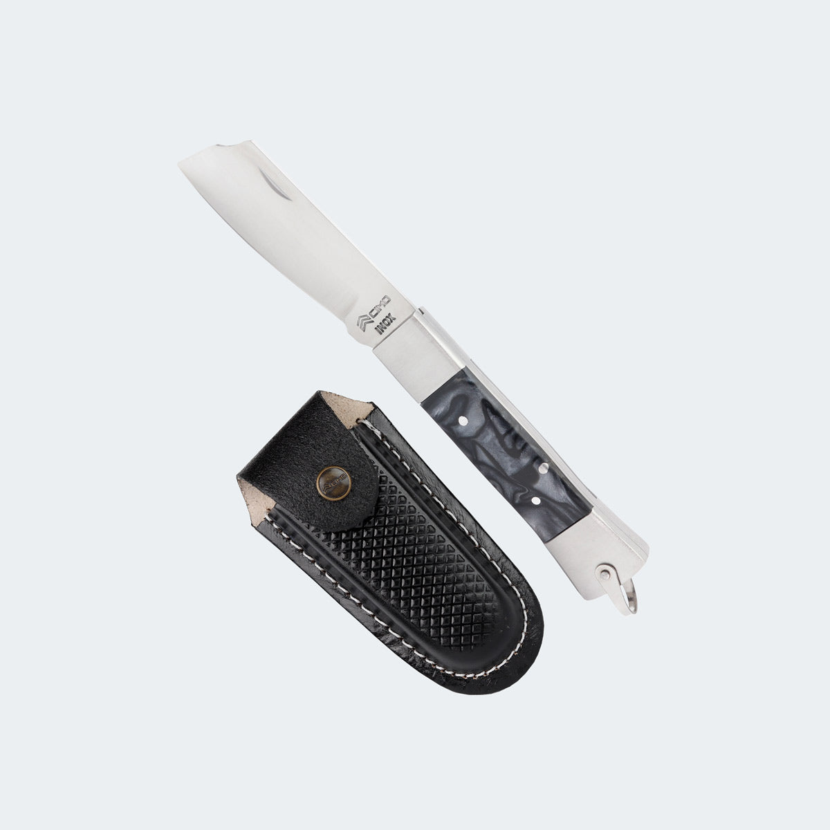 Canivete grande e robusto, sua lâmina em aço inox 420 possui formato anatômico e seu cabo tem acabamento em inox e acrílico, materiais especiais desenvolvido pela Cutelaria Cimo exclusivamente para cabos de facas e canivetes, com alto controle de qualidade resultando em um ótimo acabamento.