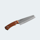 Fabricada em aço inox temperado e cortada a laser, o perfil da lâmina com ponta cleaver e fabricada a partir de um monobloco, ou seja, a lâmina e o cabo são uma peça única, com isso a faca fica resistente e com peso balanceado.